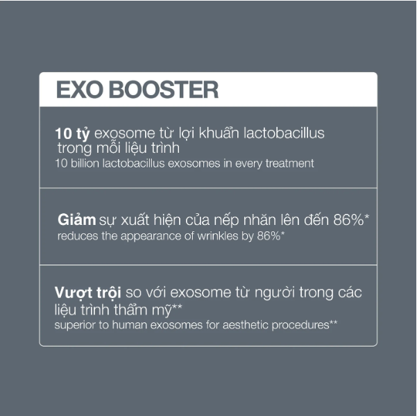 • Mỗi lần điều trị chứa 10 tỷ exosome từ lợi khuẩn lactobacillus