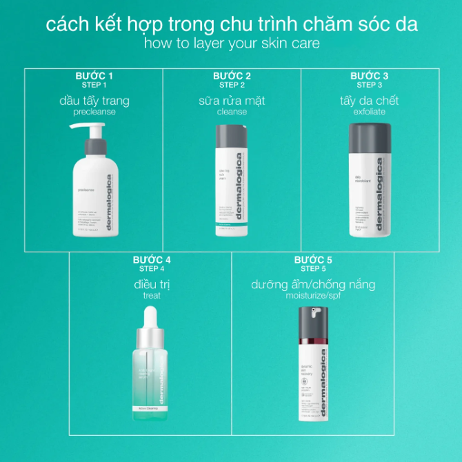 Thực hiện 2 bước Làm sạch của Dermalogica, bắt đầu bằng PreCleanse. Thoa một lượng nhỏ bằng hạt đậu thành bọt trong tay ướt. Thoa lên mặt và cổ đã được làm ẩm, mát xa theo chuyển động tròn đồng thời tập trung vào những vùng da bị tắc nghẽn và tiết dầu. Tránh vùng mắt. Rửa sạch với nước ấm. Tiếp tục với sản phẩm điều trị Age Bright Clearing Serum, hoặc chế độ Active Clearing được kê toa cho bạn.